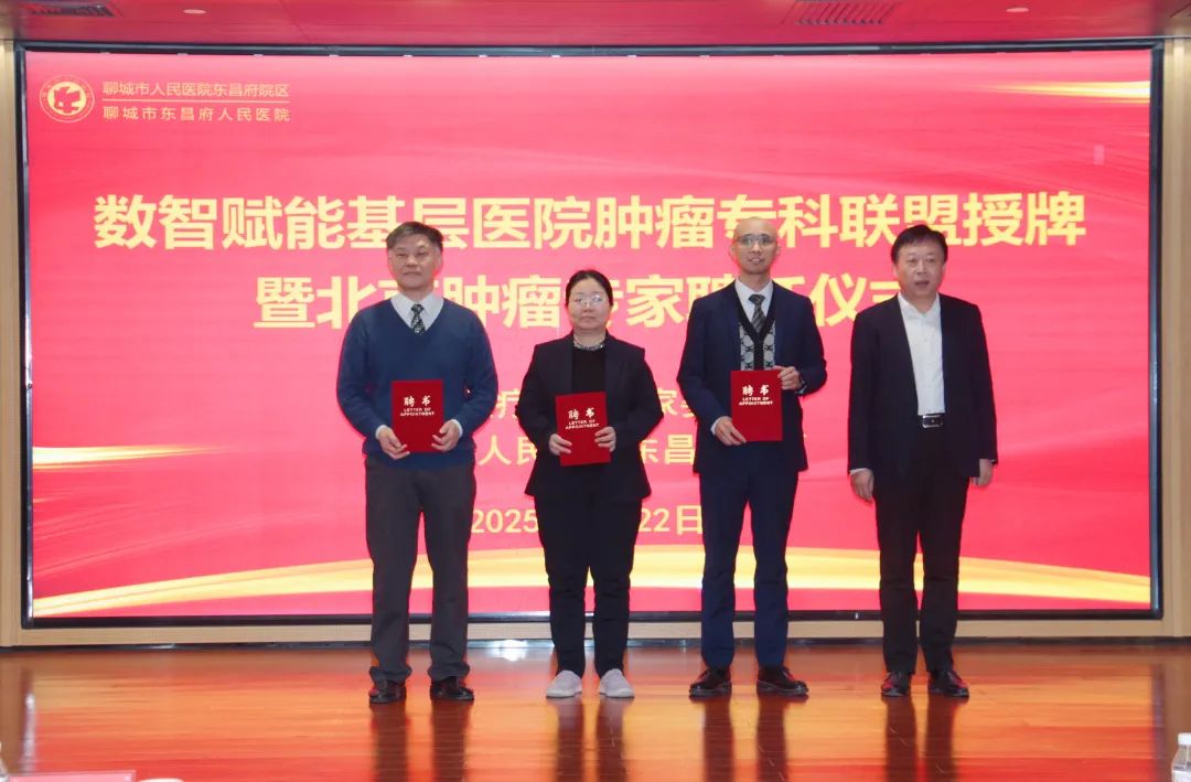 会议期间,聊城市数智赋能基层医院肿瘤专科联盟正式成立。侯森副会长与王红副主任医师共同为东昌府区中医院、莘县中医院、阳谷县中医医院、冠县新华医院等联盟单位授牌。王吉民局长为肿瘤领域的王济东、丁晓燕、陈星宇三位专家颁发了特聘专家聘书,进一步充实了聊城肿瘤医疗的专家力量。